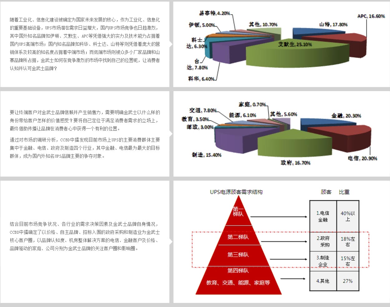 由此CCBD中擂對政府、行業客戶及普通消費者等金武士目標及影響消費群進行深入調研。通過研究發現安全、可靠、實效、解決問題是目標消費者所最為關注的需求點。對于客戶來說,他們要的不僅僅UPS產品,而是一個完整的電力保護解決方案 。