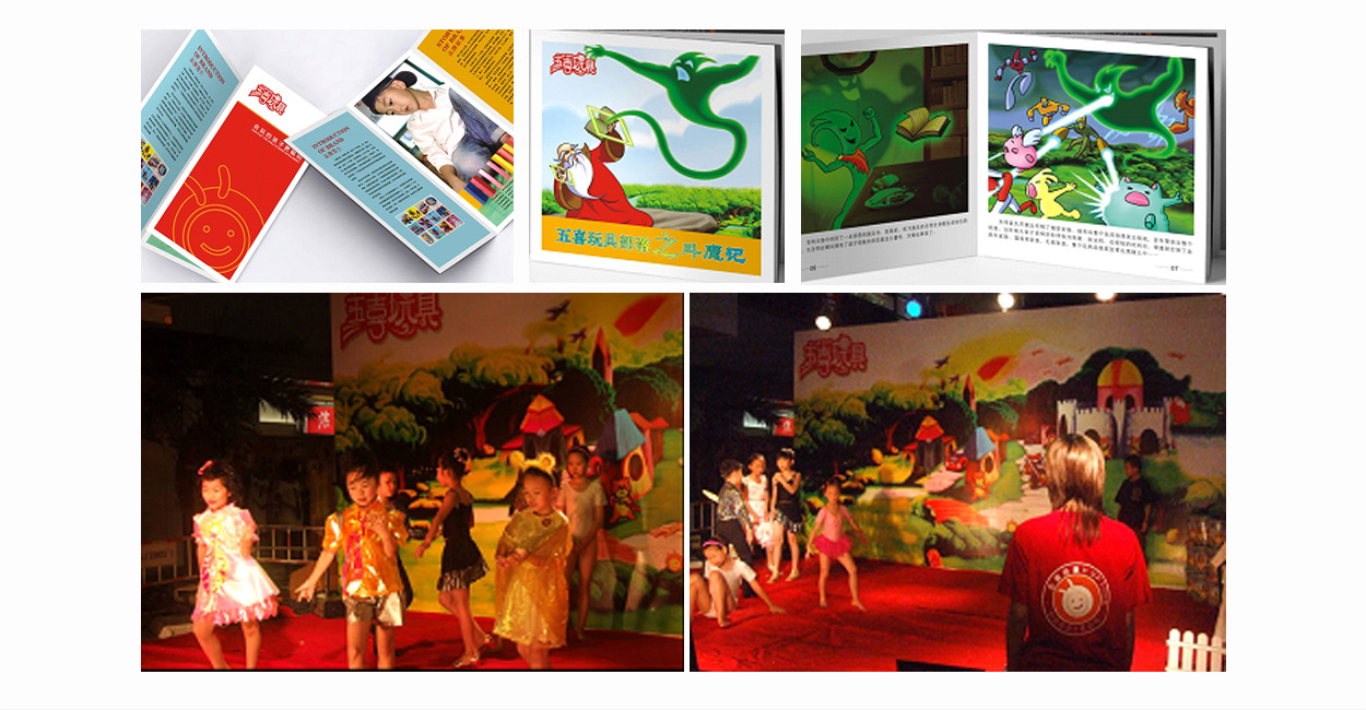 為了讓品牌更加讓兒童易記與識別,我們將品牌的簡介編寫成品牌童話故事,利用小人、連環畫、手冊、話劇等多種方式,全面放大五喜玩具部落的品牌形象,使品牌傳播更具力量。 所以在形象推廣上,我們努力通過角色營銷方式來塑造一個不同的五喜: